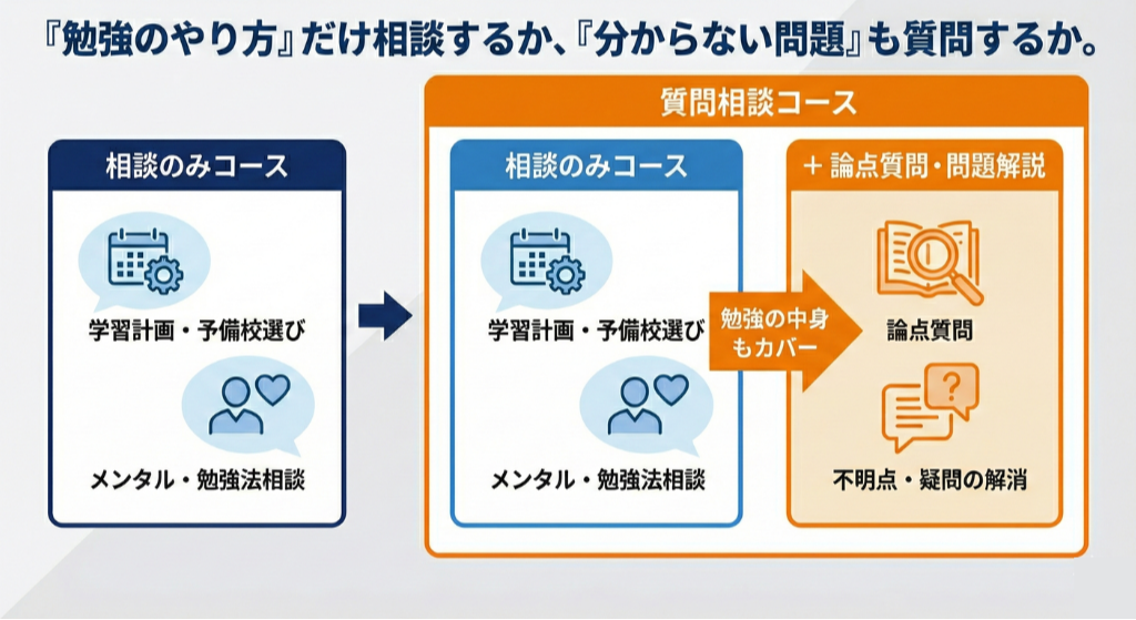 できること: 学習計画・予備校選び・メンタル相談・勉強法相談 + 論点質問・不明点解消